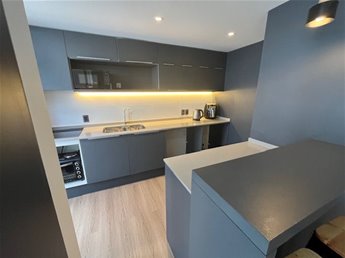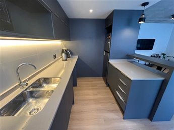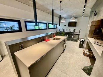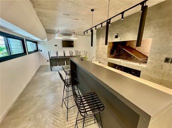 -Cocina integrada al living con barra, con anafe empotrado, y espacio para horno también de empotrar.